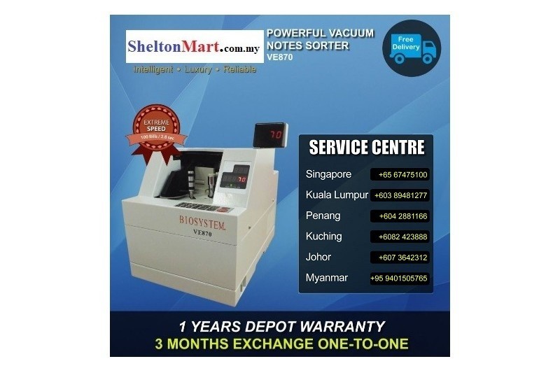 Powerful Vacuum Notes Counter UV Function Cater for Mix Polymer & Paper Notes ≥100 Bills/4sec Notes Size: 110*45mm ~ 240*130mm Dimension (WxHxD): 270 x 790 x 300mm Net Weight: 45.0kg 1 year depot warranty