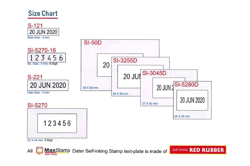 All Text-plate are made of Red Rubber -6 digit numbering Word: 1.5mm thickness Base: 0.4mm thickness Number Size: Height 4mm Size: 22 x 44mm Cover Selection: Black/ Grey/ Pink/ Violet/ Blue/ L.Blue/ L.Green/ Yellow/ Orange/ Red Ink Available: Blue/Black/Red/Green/Violet *Please email us the draft: sales@sheltonmart.com.my