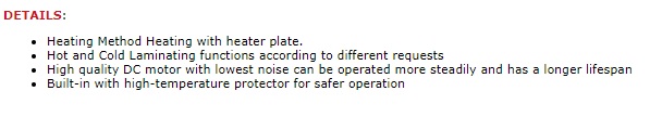 DETAILS: Heating Method Heating with heater plate. Hot and Cold Laminating functions according to different requests High quality DC motor with lowest noise can be operated more steadily and has a longer lifespan Built-in with high-temperature protector for safer operation