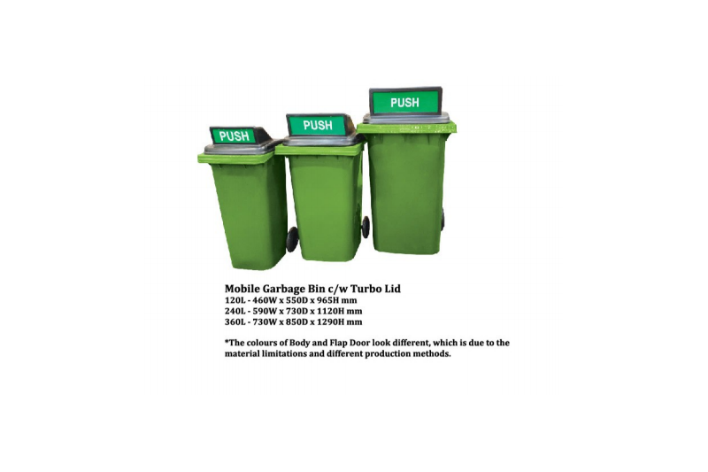 Mobile Garbage Bin 2-Wheel c/w Turbo Lid (120L / 240L / 360L) Item Size (mm) Recycle Mobile Garbage Bin 3 In 1 c/w Turbo Lid - 120 liters 460W X 550D X 965H Recycle Mobile Garbage Bin 3 In 1 c/w Turbo Lid - 240 liters 590W X 730D X 1120H Recycle Mobile Garbage Bin 3 In 1 c/w Turbo Lid - 360 liters 730W X 850D X 1290H...