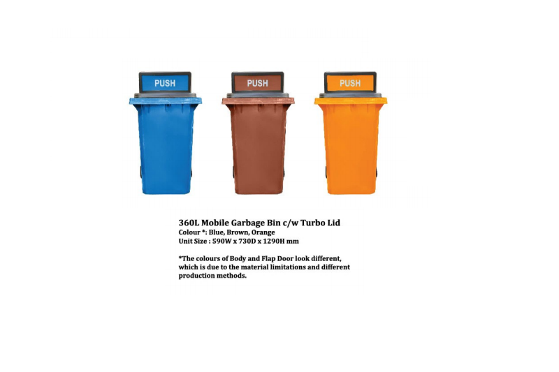 Mobile Garbage Bin 2-Wheel c/w Turbo Lid (120L / 240L / 360L) Item Size (mm) Recycle Mobile Garbage Bin 3 In 1 c/w Turbo Lid - 120 liters 460W X 550D X 965H Recycle Mobile Garbage Bin 3 In 1 c/w Turbo Lid - 240 liters 590W X 730D X 1120H Recycle Mobile Garbage Bin 3 In 1 c/w Turbo Lid - 360 liters 730W X 850D X 1290H...