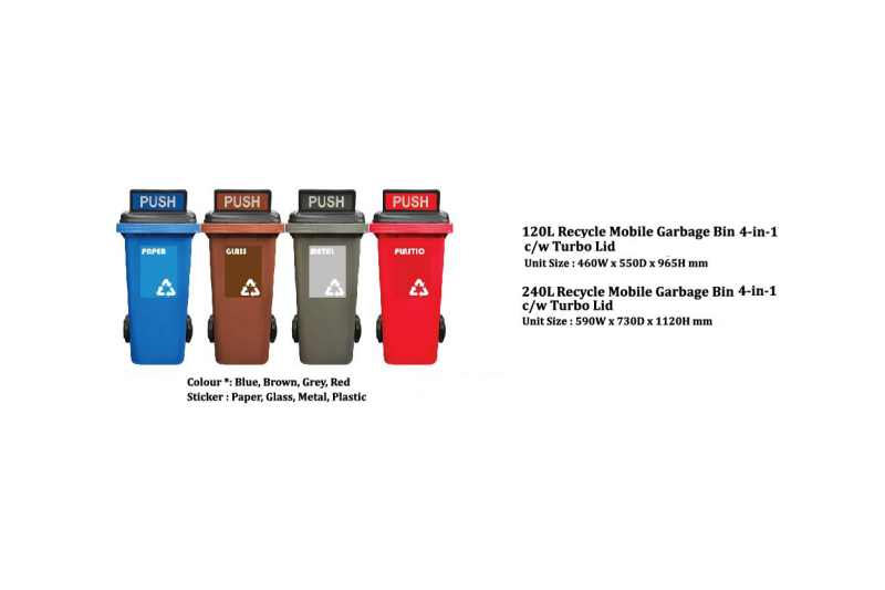 Mobile Garbage Bin 2-Wheel c/w Turbo Lid (120L / 240L / 360L) Item Size (mm) Recycle Mobile Garbage Bin 3 In 1 c/w Turbo Lid - 120 liters 460W X 550D X 965H Recycle Mobile Garbage Bin 3 In 1 c/w Turbo Lid - 240 liters 590W X 730D X 1120H Recycle Mobile Garbage Bin 3 In 1 c/w Turbo Lid - 360 liters 730W X 850D X 1290H...
