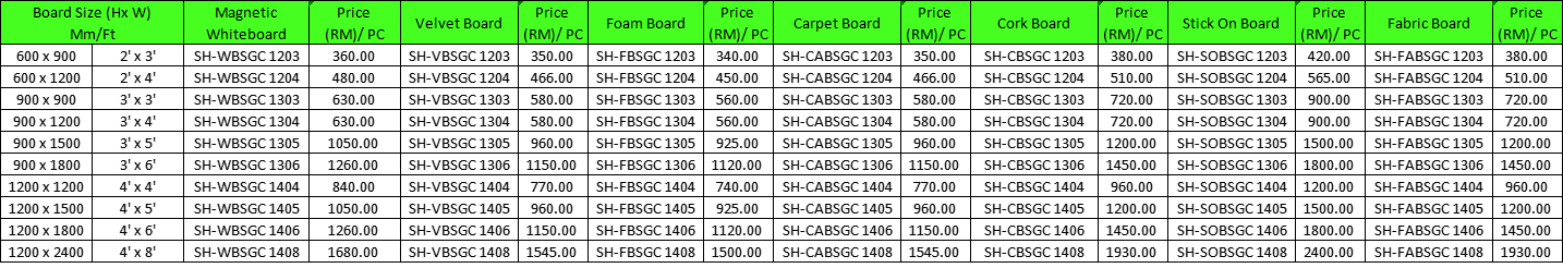 Aluminium Frame Notice Board -Made of high-quality material with a durable aluminium frame. -Easy installation and bright color of the notice board. CUSTOMISED SIZE AVAILABLE UPON REQUEST *Please state the colour preferred according to Colour Selection Guide.