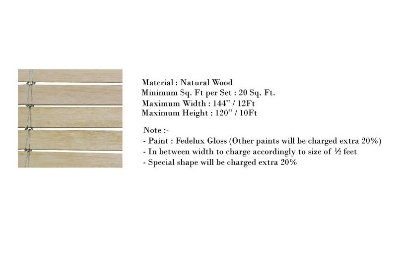 Material: Natural Bamboo Minimum Sq. Ft per Set: 20 Sq.Ft Max Width: 10FT/ 120" Max Height: 10FT/ 120"