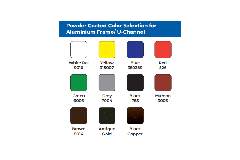 Glass Options: • Standard Glass • Laminated Glass • Crystal Glass / Ultra Clear Glass • Frosted Glass (Sandblast/ Frosted Film) • Tempered Laminated Glass • Safety Tempered Glass Description: • Glass Thickness: 5 mm (Standard), 6 mm & 8 mm (max) • Warranty: 1 year warranty from date of installation Surface Aluminium Size Available: • 38...
