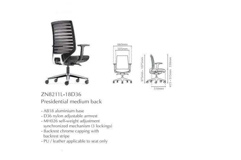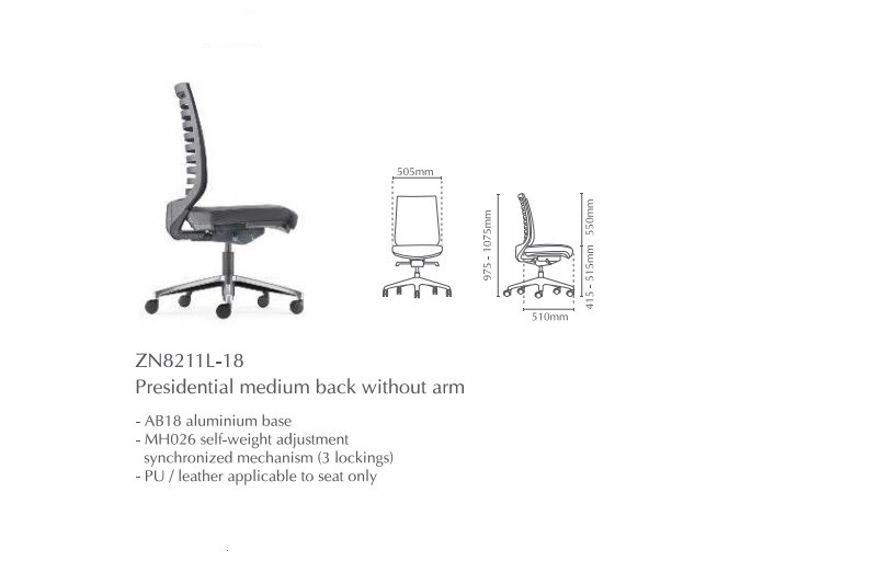 | 03 | ZN8211L-18 | Presidential Medium Back without Arm | 788.00 | 806.00 | 846.00 | 1002.00 |