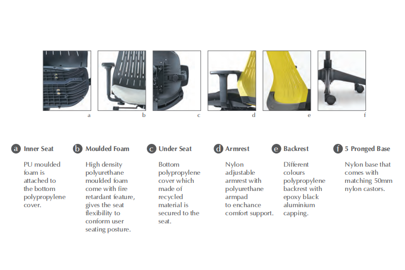 Clover is a hardworking task chair designed to handle long hours of serious sitting. With fully upholstered back and PU padded arrest, Clover brings an element of sophistication to any workspace. Specifications: 4D Adjustable Armrest with Polyurethane Armpad Fixed Armrest 5 Pronged Base Nylon Casting Adjustable Seat Depth/ Slider Mechanism Self...