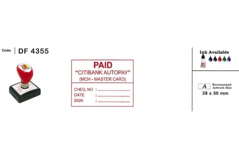 - Multi ink colour or single ink colour - Easy to re-inking - Cystal clear imprints (sharper impression) - More reliable & long lasting pre-ink stamp Ink Available: Blue/ Black/ Red/ Green/ Violet/ Brown/ Pink/ Orange/ Yellow/ SkyBlue *Please email us the draft: sales@sheltonmart.com.my