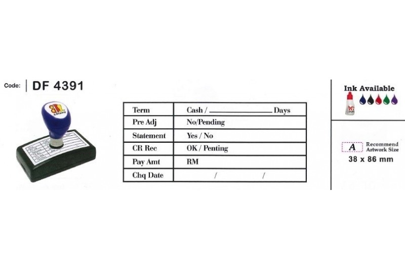- Multi ink colour or single ink colour - Easy to re-inking - Cystal clear imprints (sharper impression) - More reliable & long lasting pre-ink stamp Ink Available: Blue/ Black/ Red/ Green/ Violet/ Brown/ Pink/ Orange/ Yellow/ SkyBlue *Please email us the draft: sales@sheltonmart.com.my
