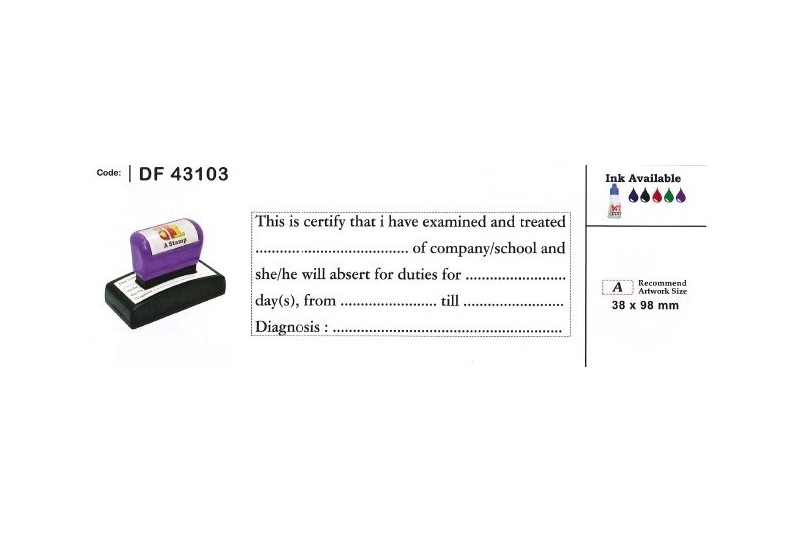 - Multi ink colour or single ink colour - Easy to re-inking - Cystal clear imprints (sharper impression) - More reliable & long lasting pre-ink stamp Ink Available: Blue/ Black/ Red/ Green/ Violet/ Brown/ Pink/ Orange/ Yellow/ SkyBlue *Please email us the draft: sales@sheltonmart.com.my