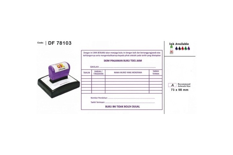 - Multi ink colour or single ink colour - Easy to re-inking - Cystal clear imprints (sharper impression) - More reliable & long lasting pre-ink stamp Ink Available: Blue/ Black/ Red/ Green/ Violet/ Brown/ Pink/ Orange/ Yellow/ SkyBlue *Please email us the draft: sales@sheltonmart.com.my