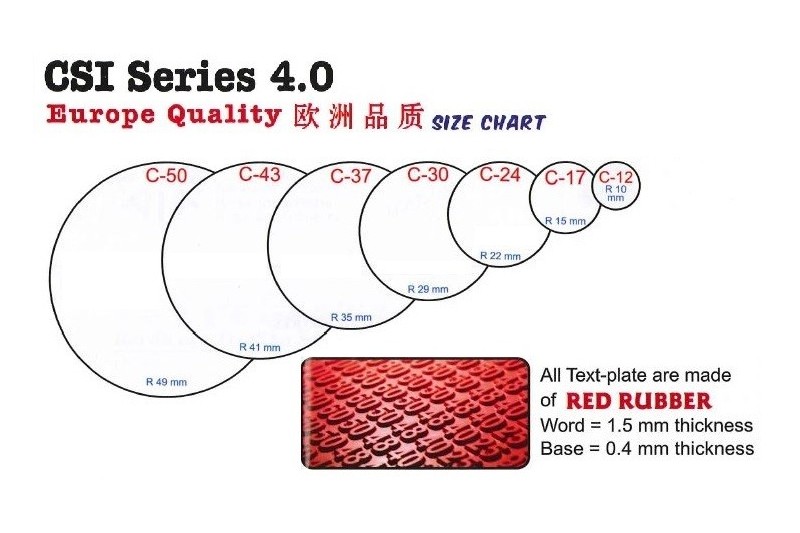 All Text-plate are made of Red Rubber Word: 1.5mm thickness Base: 0.4mm thickness Size: R 49mm Cover Selection: Grey/Blue/Yellow/Violet/Pink/Orange/L.Green Ink Available: Blue/Black/Red/Green/Violet *Please email us the draft: sales@sheltonmart.com.my