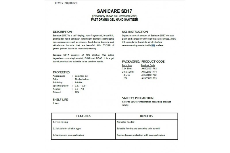 SANICARE SD17Instant Hand Sanitizer (Gel)• Fast-drying, Non-fragranced, Broad Kill• pH: Neutral Ingredients:Ethyl alcohol , Glycerine, PHMB, DDAC, Hydropropyl cellulose. Size: 50ml Packing : 72 bottle per ctn Pricing Unit Price 1 bottle RM 6 per bottle 360 bottle RM 4.20 per bottle 1512 bottle RM 3.20 per bottle...