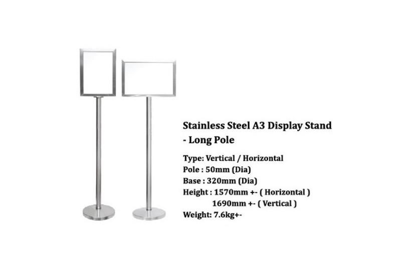 Stainless Steel A4 Display Stand - Long Pole Pole: 50mm (Dia) Base: 320mm (Dia) Height: 1520mm (Horizontal) 1620mm (Vertical) Weight:+-7.3kg
